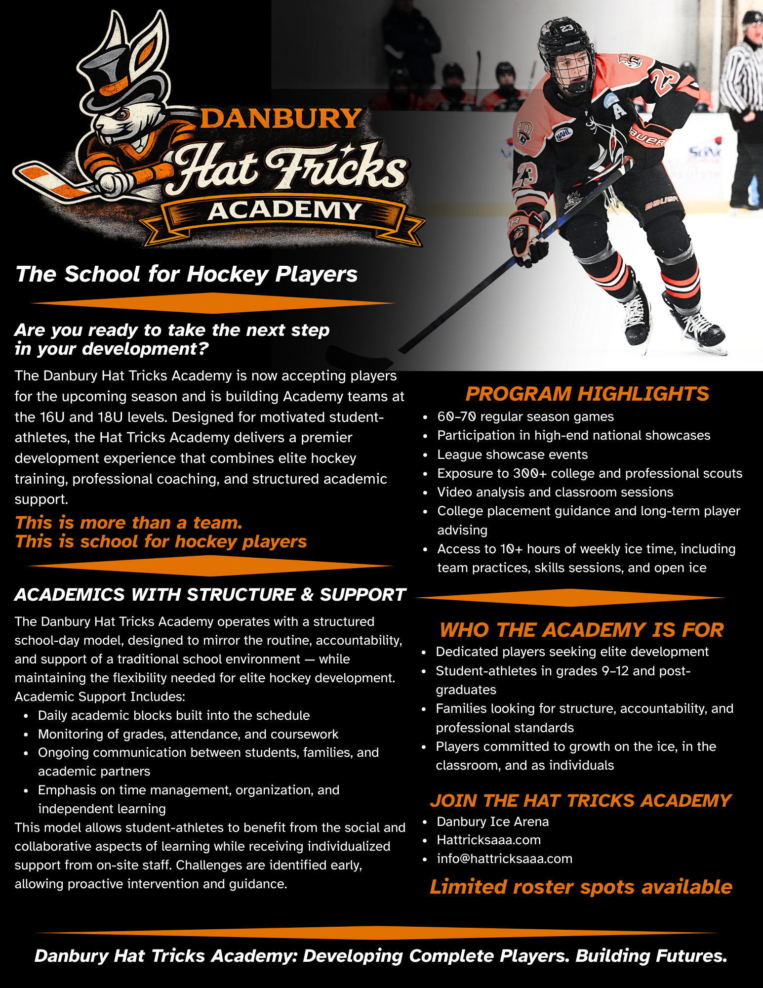 The Danbury Hat Tricks Academy is now accepting players for the upcoming season and is building Academy teams at the 16U and 18U levels. Designed for motivated student-athletes, the Hat Tricks Academy delivers a premier development experience that combines elite hockey training, professional coaching, and structured academic support.